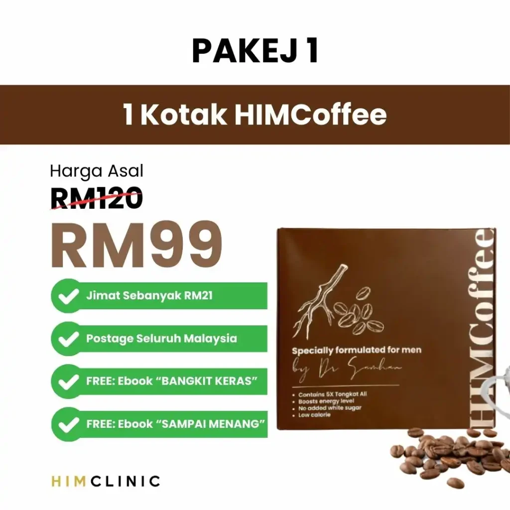 Dengan adanya ekstrak pure tongkat ali 5X ganda dari biasa dalam HimCoffee ia akan membantu untuk meningkatkan hormon TESTOSTERONE lelaki dan melancarkan lagi aliran darah dan akan membantu untuk masalah mati pucuk.